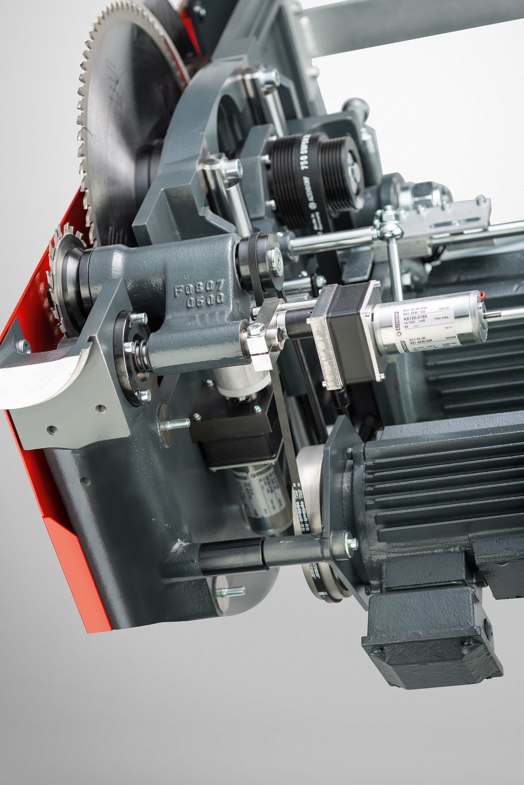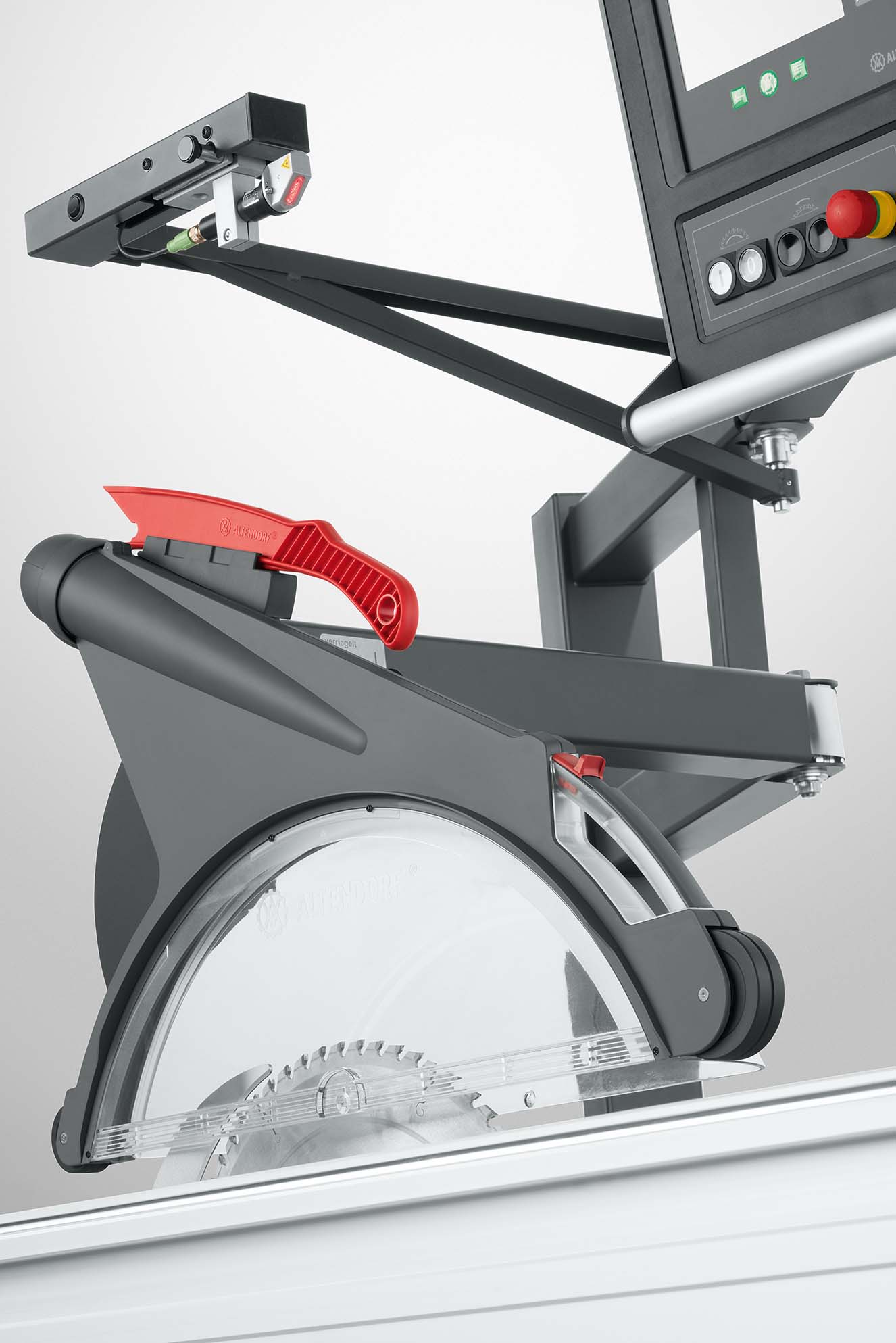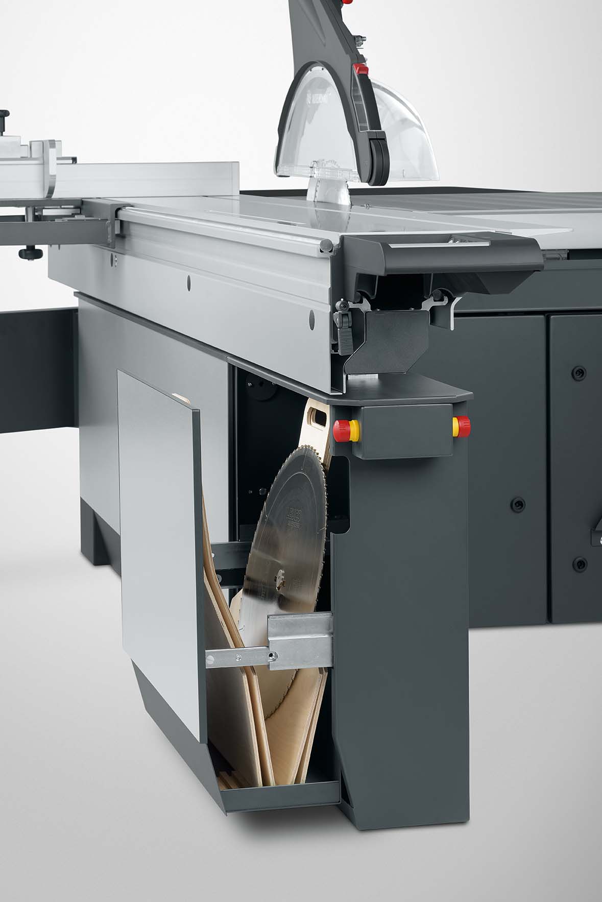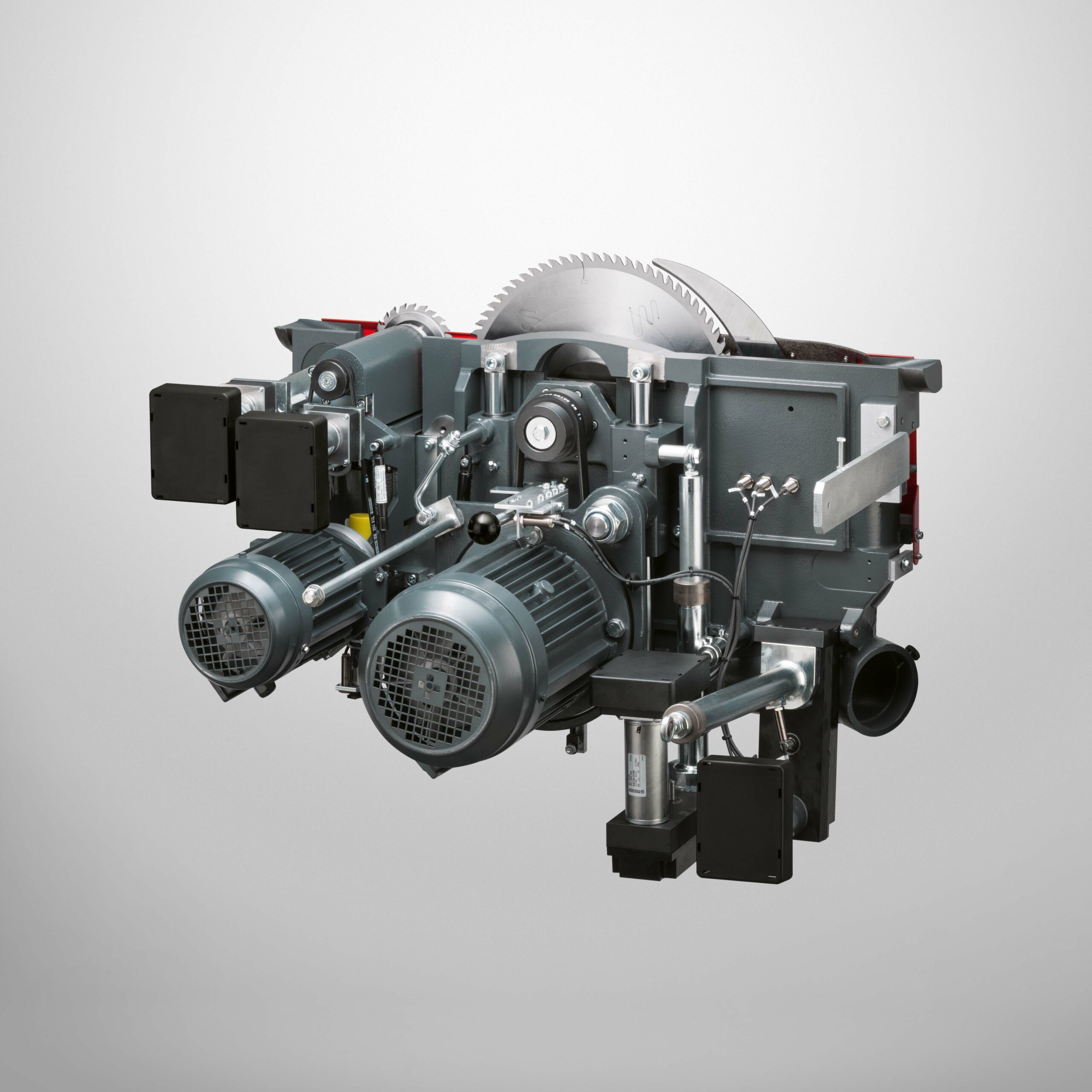 – Elektromotorische Höhen- und Schwenkverstellung 0 – 46° für das Hauptsägeblatt mit automatischer Korrektur der Schnitthöhe bei Schwenkung des Sägeaggregats