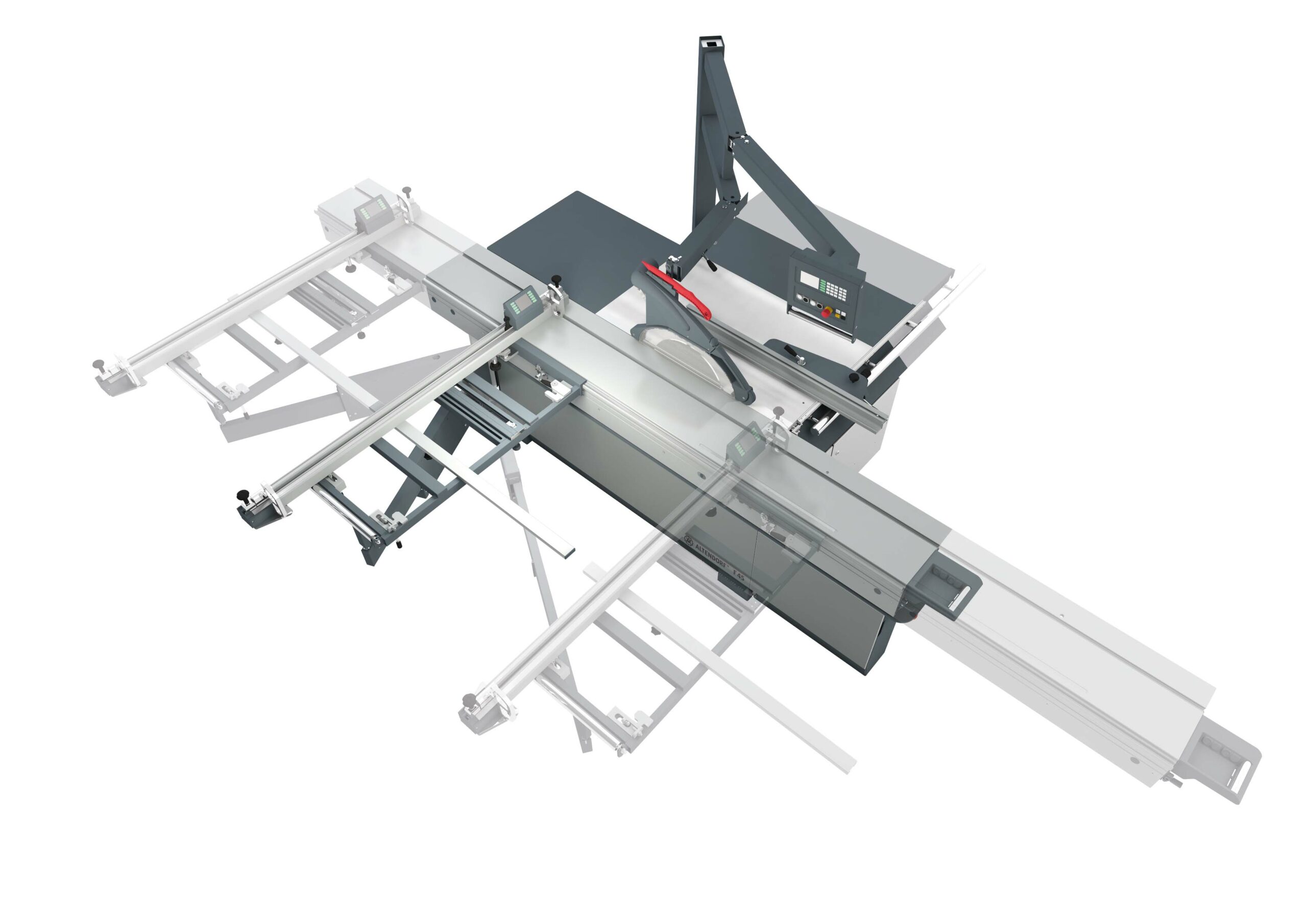 – Elektromotorische Höhen- und Schwenkverstellung, auch beidseitig (+/- 46°) *, für das Hauptsägeblatt mit automatischer Höhenkorrektur und digitalen Anzeigen