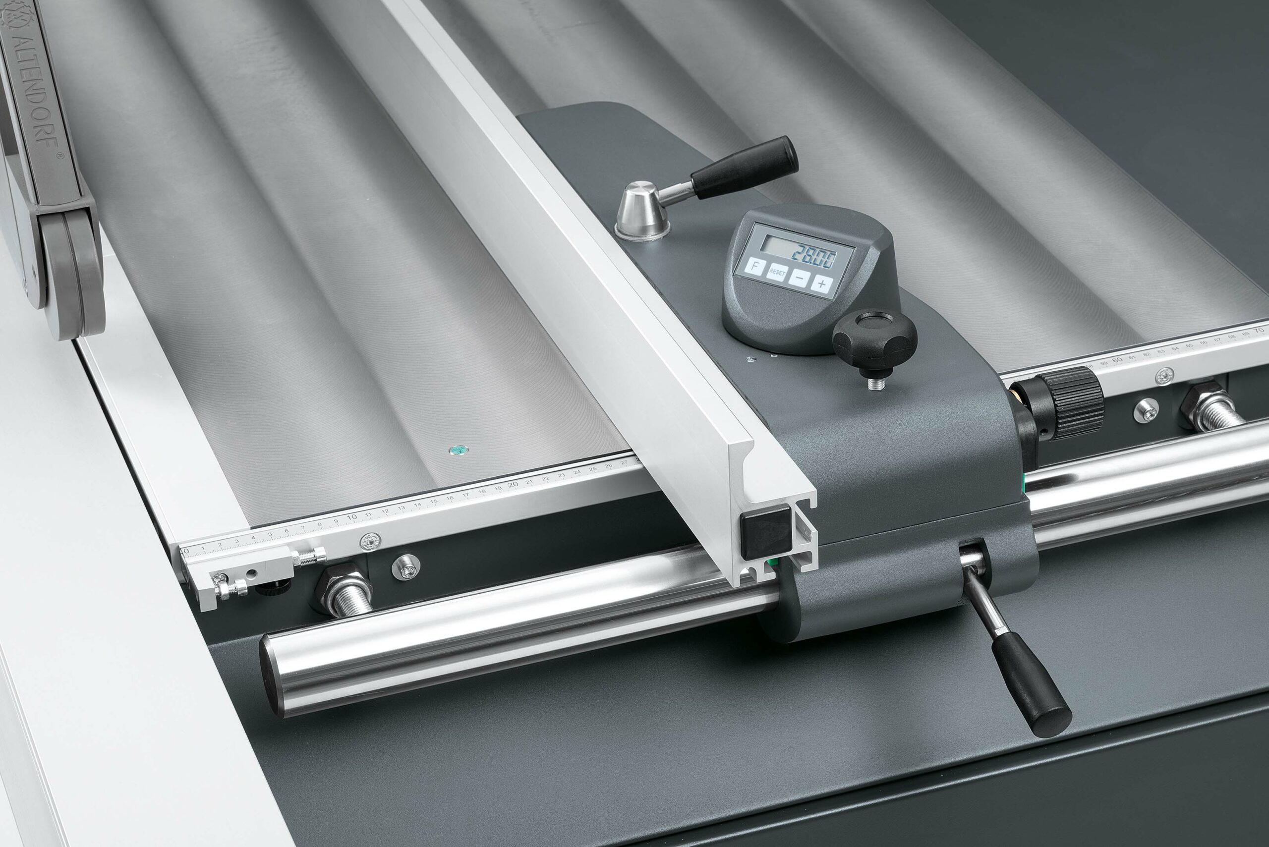 – Parallelanschlag, manuelle Verstellung, einstellbar über Maßskala, inkl. manueller Feineinstellung, Schnittbreite 1.000 mm